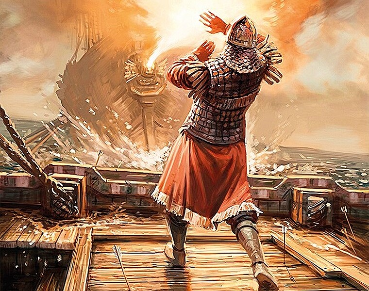 Pokouší se zkrotit oheň. Kallinikos z Heliopole pracuje na strašlivé zbrani, která má ničit nepřátelské lodě, a to i pod vodou! Jenže jeho experimenty se trochu zvrtnou.