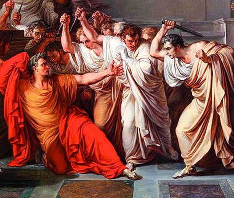 Caesar si podle starého zvyku ještě stihl zakrýt tógou obličej, aby se nemusel dívat na své vrahy. Nakonec klesne mrtvý k zemi, ubodán 23 ranami, před sochou svého starého nepřítele Pompeia (106–48 př. n. l.).