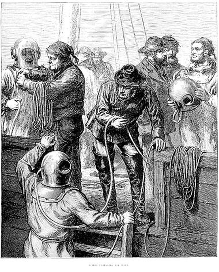 Vynálezce Andrew Becker právě veřejně odzkoušel patrně první potápěčský oblek na světě. Byl vyroben z kůže a přilbu na hlavě doplňovalo malé okénko.