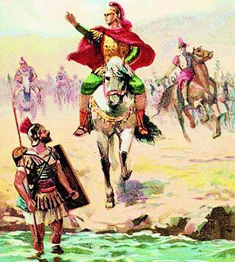překročí řeku Rubikon, která tvoří hranici mezi Galií a Římem, čímž poruší římský zákon o velezradě zakazující správci provincie, aby s vojskem přestoupil její hranice.