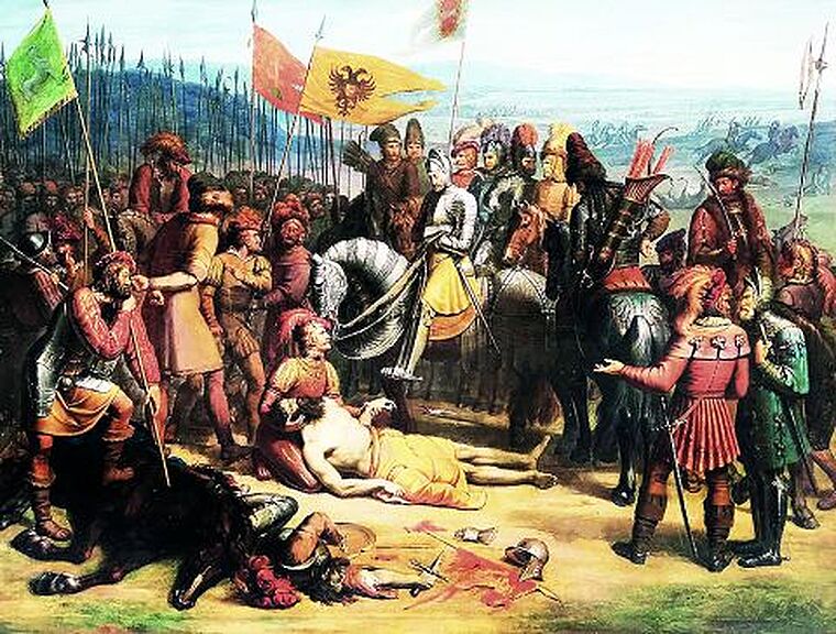 Na chladné zemi leží tělo Přemysla Otakara II. (kolem r. 1233–1278), zbrocené krví. Jeho hruď je poseta mnoha ranami, na hlavě se skví velký šrám.