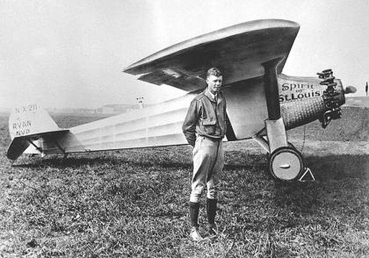 Americký pilot Charles Lindbergh (1902–1974) ve svém jednomotorovém letadle Spirit of St. Louis překonává Atlantský oceán.